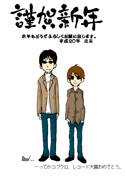 今年は、紅白でポルノグラフィティとmihimaruGTとコブクロを見たら、年賀状書きに突入です(ちょ、おまっ) 1日で着くなんて、そんな無理な話ヤンケー^^ とりあえず、良いお年を。今年11月に突如出没して、もう2ヶ月だとさ・・・・。 来年も宜しくお願いします^^ |
